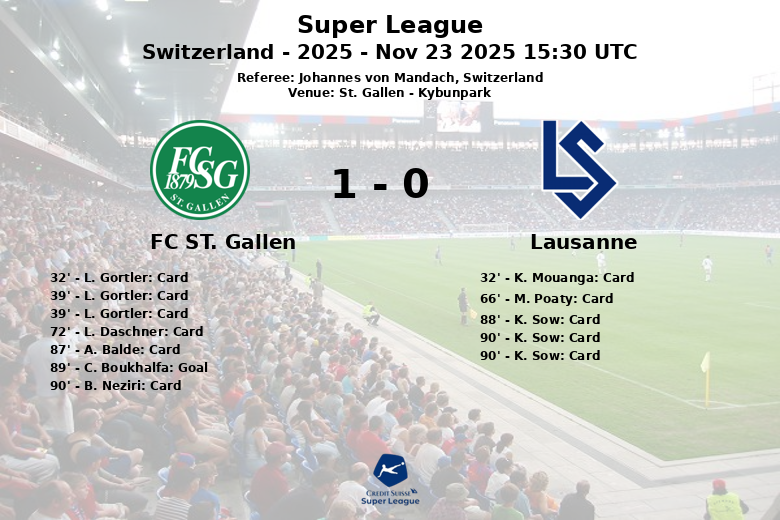 El Lausanne, con mayor posesión y generando 15 tiros, no logró concretar sus oportunidades, mostrando una falta de contundencia en el área rival. La fortuna sonrió al St. Gallen en los últimos instantes del partido, cuando un penal a favor fue convertido, otorgándoles una victoria agónica. El Lausanne terminó el encuentro con un jugador menos tras otra expulsión sobre el final.