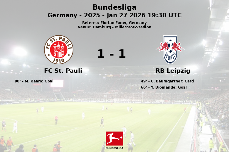 El partido se mantuvo equilibrado durante gran parte del tiempo. En el minuto 49, C. Baumgartner del RB Leipzig vio la tarjeta amarilla. El marcador se abrió en el minuto 66 con un gol de Y. Diomande para el RB Leipzig. Cuando parecía que el partido estaba sentenciado, M. Kaars del St. Pauli anotó de penalti en el minuto 90, poniendo emoción al final del encuentro.
