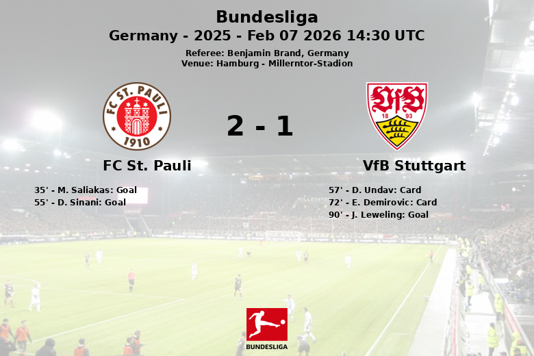 El equipo local se adelantó en el minuto 35 con un gol de M. Saliakas, tras una asistencia de A. Pyrka, desatando la euforia en las gradas. Ya en la segunda mitad, D. Sinani amplió la ventaja desde el punto de penalti en el minuto 55. El Stuttgart intentó reaccionar, pero la defensa del St. Pauli se mostró sólida. La frustración del Stuttgart se evidenció con dos tarjetas amarillas para D. Undav y E. Demirovic. En el tiempo añadido, J. Leweling marcó para el Stuttgart en el minuto 90, tras una asistencia de Jeremy Arevalo, pero fue demasiado tarde para cambiar el destino del partido. El St. Pauli se llevó la victoria con un resultado final de 2 a 1, demostrando una gran efectividad con 15 tiros totales, 7 de ellos a puerta.