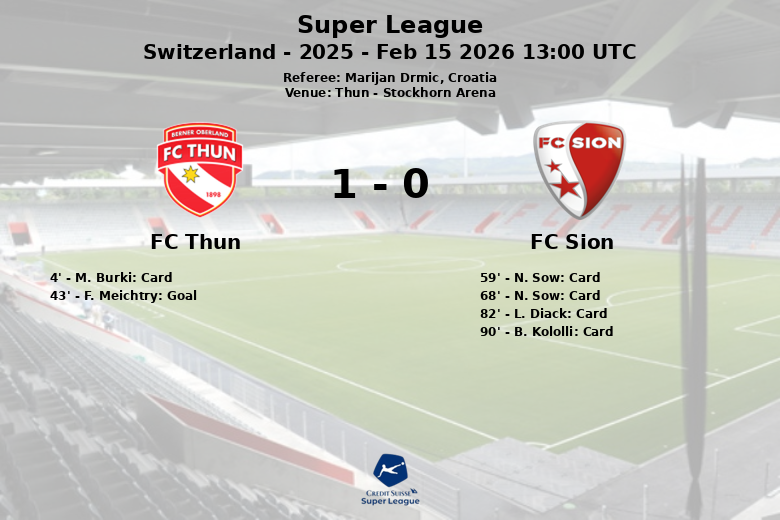 Por su parte, el FC Sion, que dominó la posesión del balón con un 53%, no logró traducir este dominio en ocasiones claras de gol. De los 6 disparos realizados, solo uno encontró el arco rival. La disciplina fue un problema constante para el equipo visitante, que cometió 12 faltas y vio a dos de sus jugadores, N. Sow y L. Diack, expulsados del campo, además de la tarjeta amarilla recibida por B. Kololli sobre el final del partido. El árbitro croata Marijan Drmic tuvo una tarde ajetreada, impartiendo justicia en un partido que dejó mucho que desear en cuanto al juego limpio. El partido termino con el marcador FC Thun 1 FC Sion 0.