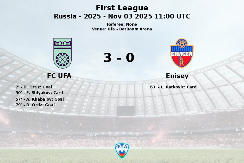 Ufa, Rusia – En un vibrante partido disputado en el BetBoom Arena, el FC UFA se impuso con autoridad al Enisey en la jornada 17 de la First League rusa. Desde el inicio, el FC UFA demostró su superioridad, abriendo el marcador tempranamente, al minuto 7, con un gol de D. Ortiz. El dominio del FC UFA se consolidó en la segunda mitad, con un gol de A. Khabalov al minuto 57. Ortiz volvió a hacerse presente en el marcador al minuto 79, sellando la victoria para el equipo local. El partido estuvo marcado por la intensidad, reflejada en las tarjetas amarillas mostradas a E. Shlyakov del FC UFA y a L. Ratkovic del Enisey. A pesar de los esfuerzos del Enisey, el FC UFA mantuvo el control y se llevó una merecida victoria ante su afición.