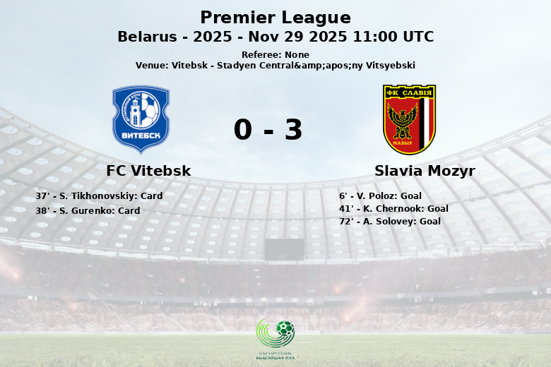 El FC Vitebsk se vio superado y la frustración se reflejó en dos tarjetas amarillas mostradas a S. Tikhonovskiy y S. Gurenko en la primera mitad. El Slavia Mozyr amplió su ventaja en el minuto 41 con un gol de K. Chernook.