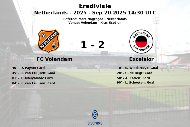La segunda mitad fue una batalla táctica en la que ambos equipos buscaron la victoria. El partido se caracterizó por una serie de tarjetas amarillas para ambos lados. Cuando parecía que el empate era inevitable, el Excelsior sorprendió al FC Volendam en el minuto 90 con un gol de L. Schouten, con asistencia de R. Meissen.