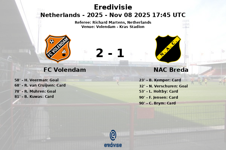 El partido se volvió aún más tenso en los minutos finales, con tarjetas amarillas para R. van Cruijsen y B. Kuwas del Volendam, y las expulsiones de F. Jensen y C. Brym del NAC Breda en el tiempo de descuento.