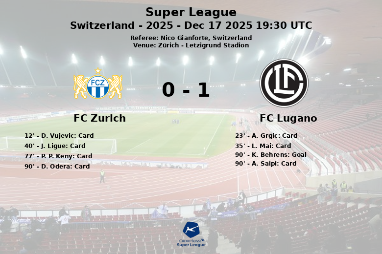 La segunda mitad mantuvo la intensidad, con el Lugano buscando con insistencia el gol. El Zúrich, aunque con más posesión, no logró concretar sus oportunidades. La tensión aumentó en los minutos finales, culminando con el gol de K. Behrens en el minuto 90, tras una asistencia de U. Bislimi, que dio la victoria al Lugano. El partido terminó de forma caótica, con una tarjeta roja para D. Odera del Zúrich y una amarilla para A. Saipi del Lugano, ambos también en el minuto 90.