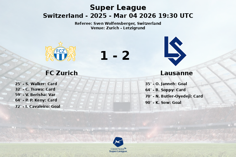 En la segunda mitad, el Zúrich buscó con insistencia el empate, pero un gol de V. Berisha fue anulado por fuera de juego en el minuto 59. Finalmente, I. Cavaleiro logró igualar el marcador en el minuto 72. Cuando parecía que el Zúrich se llevaría la victoria, K. Sow anotó para el Lausanne en el tiempo de descuento, sellando el empate final. El partido fue dirigido por Sven Wolfensberger. El juego sucio se vio reflejado en 3 tarjetas amarillas para el Zúrich y 2 para el Lausanne.