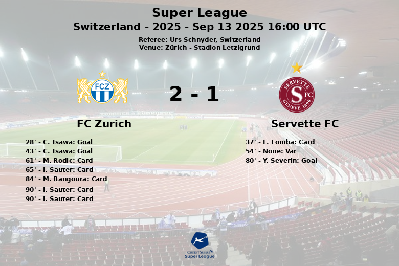 Zúrich, Suiza – En un encuentro de la Superliga marcado por la intensidad y la controversia, el FC Zúrich logró imponerse al Servette FC, aunque no sin complicaciones. El partido, disputado en el Stadion Letzigrund, vio al FC Zúrich tomar la delantera gracias a una destacada actuación de C. Tsawa, quien anotó dos goles en la primera mitad (minutos 28 y 43), el primero con asistencia de B. Krasniqi.