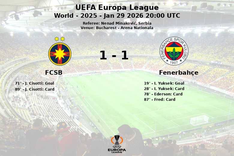 Bucarest, Rumania – En un encuentro vibrante disputado en la Arena Nationala, el FCSB y el Fenerbahçe igualaron a un gol en partido correspondiente a la fase de grupos de la UEFA Europa League. El equipo turco se adelantó en el marcador al minuto 19 gracias a un tanto de I. Yuksek, asistido por K. Akturkoglu. Yuksek, sin embargo, también se ganó una tarjeta amarilla en el minuto 28.