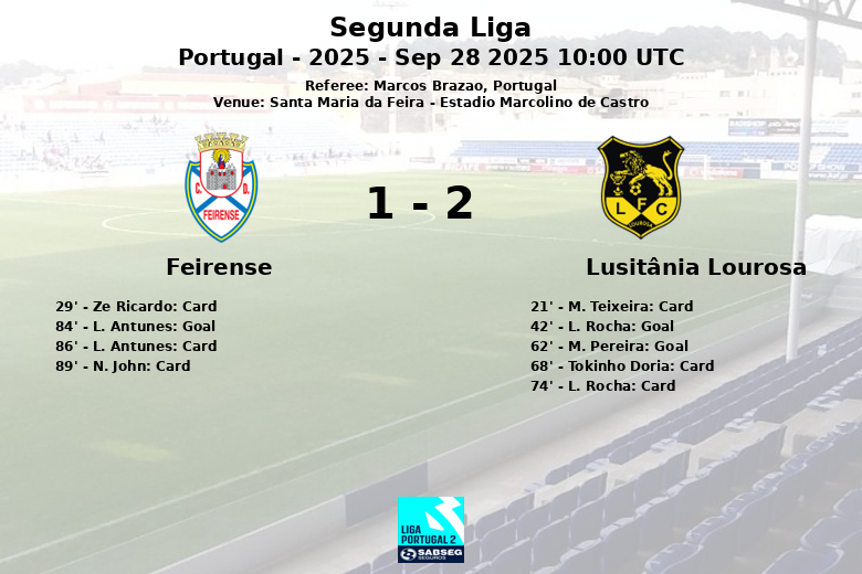 En la segunda mitad, el Lusitânia Lourosa amplió su ventaja en el minuto 62 con un gol de M. Pereira, con asistencia de Arsenio. El Feirense no se rindió y logró descontar en el minuto 84 a través de un penal convertido por L. Antunes. El encuentro se caracterizó por una serie de tarjetas amarillas adicionales, incluyendo una a Tokinho Doria del Lusitânia Lourosa en el minuto 68, a L. Rocha en el minuto 74, a L. Antunes del Feirense en el minuto 86, y a N. John del Feirense en el minuto 89.