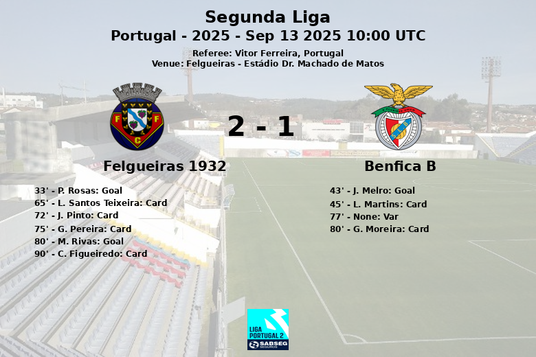 Un emocionante encuentro en el Estádio Dr. Machado de Matos vio al Felgueiras 1932 y al Benfica B repartirse los puntos en un partido lleno de acción. El Felgueiras tomó la delantera al minuto 33 gracias a un gol de P. Rosas, asistido por Lucas Duarte. Sin embargo, el Benfica B respondió antes del descanso, con J. Melro igualando el marcador al minuto 43.