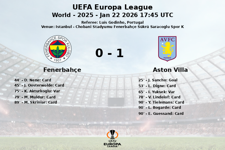 El partido estuvo marcado por la intensidad y la disputa en el mediocampo, reflejado en la gran cantidad de tarjetas amarillas mostradas por el árbitro Luís Godinho: cuatro para el Fenerbahçe (D. Nene, J. Oosterwolde, M. Muldur y M. Skriniar) y seis para el Aston Villa (L. Digne, V. Lindelof, Y. Tielemans, L. Bogarde y E. Guessand).