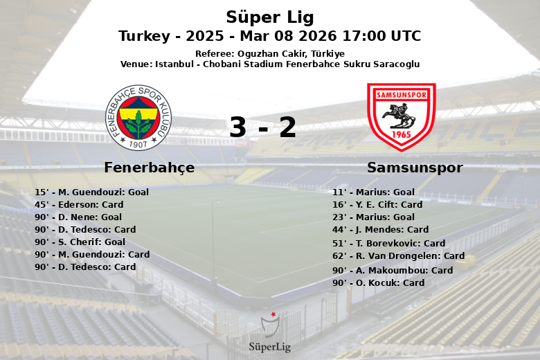 El Samsunspor sorprendió al inicio, con un doblete de Marius (11′ y 23′) que lo puso en ventaja. El Fenerbahçe respondió rápidamente con un tanto de Guendouzi al minuto 15, asistido por Musaba. El partido se mantuvo muy disputado, con un alto número de faltas por parte del Samsunspor (24) y varias tarjetas amarillas mostradas por el árbitro Oguzhan Cakir a ambos equipos.