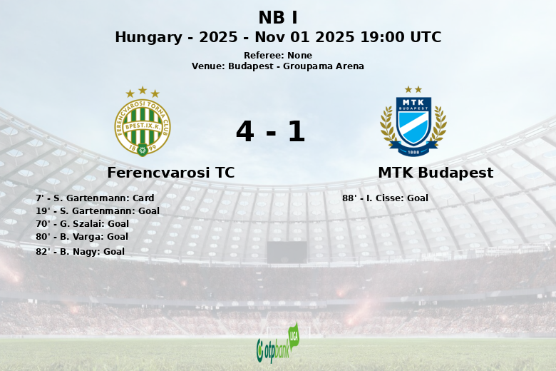 Budapest, Hungría – El Ferencvarosi TC demostró su superioridad en el derbi contra el MTK Budapest, celebrado en el Groupama Arena. El encuentro, correspondiente a la jornada 12 de la NB I, temporada 2025, finalizó con un marcador que refleja la disparidad en el juego desplegado por ambos equipos.