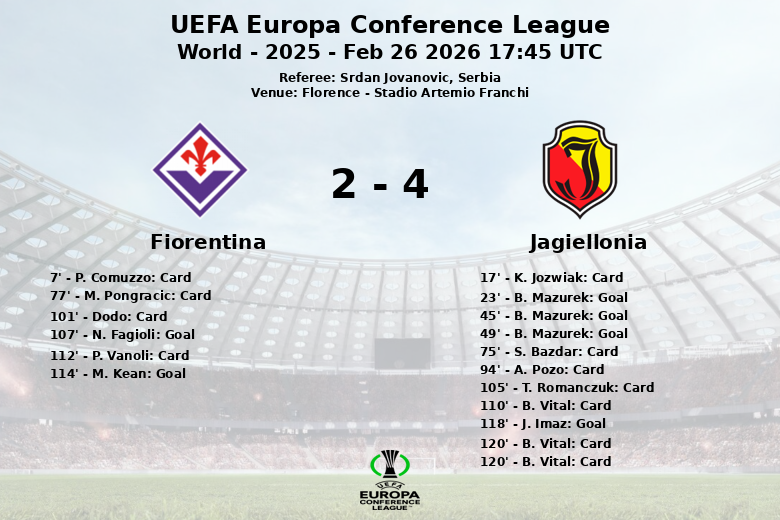 El Jagiellonia tomó la delantera temprano con un gol de B. Mazurek al minuto 23, sin asistencia. Mazurek volvió a marcar justo antes del descanso, ampliando la ventaja para su equipo. Al inicio del segundo tiempo, Mazurek completó su hat-trick al minuto 49, con asistencia de A. Pululu, poniendo el marcador cuesta arriba para la Fiorentina.