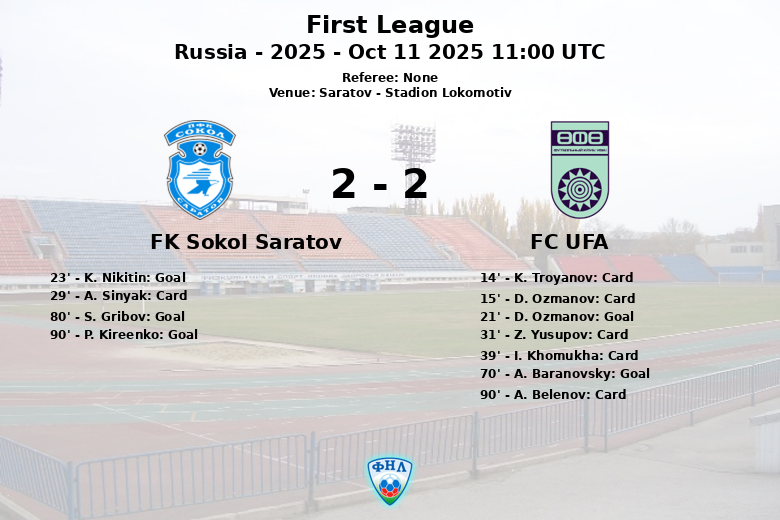 Saratov, Rusia – En un partido cargado de tensión y emociones, el FC UFA se impuso al FK Sokol Saratov en el Stadion Lokomotiv en un encuentro correspondiente a la jornada 14 de la First League. El partido, disputado el 11 de octubre de 2025, estuvo marcado por un alto número de tarjetas y goles.