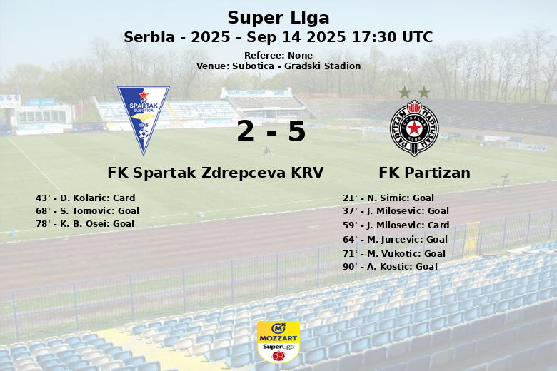 El Partizan abrió el marcador al minuto 21 con un gol de N. Simic, asistido por M. Vukotic. J. Milosevic amplió la ventaja al minuto 37 gracias a una asistencia de M. Jurcevic. El Spartak sufrió una tarjeta amarilla a los 43 minutos para D. Kolaric.