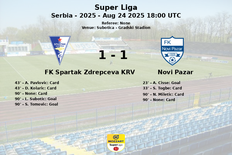 El partido entró en una fase de alta intensidad en el tiempo de descuento. L. Subotic igualó el marcador para el FK Spartak Zdrepceva KRV en el minuto 90 con un gol, instantes después S. Tomovic erro el penal. Sin embargo, su tanto no fue suficiente para asegurar la victoria. El partido finalizó con varias tarjetas amarillas mostradas por el árbitro, incluyendo una a N. Miletic del Novi Pazar.