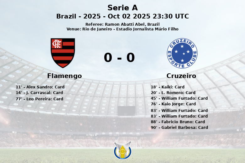 El árbitro Ramon Abatti Abel tuvo una noche ajetreada, mostrando un total de 11 tarjetas amarillas y una roja. El Cruzeiro fue el equipo más amonestado, con 7 tarjetas amarillas y la expulsión de William Furtado en el minuto 83, complicando aún más sus aspiraciones en el tramo final del partido. El Flamengo, por su parte, recibió 3 amonestaciones. El partido finalizó con un alto número de faltas cometidas por ambos equipos, 16 para el Flamengo y 19 para el Cruzeiro. A pesar del dominio del Flamengo, el Cruzeiro se mantuvo firme, logrando un resultado que refleja la intensidad y el equilibrio del encuentro.