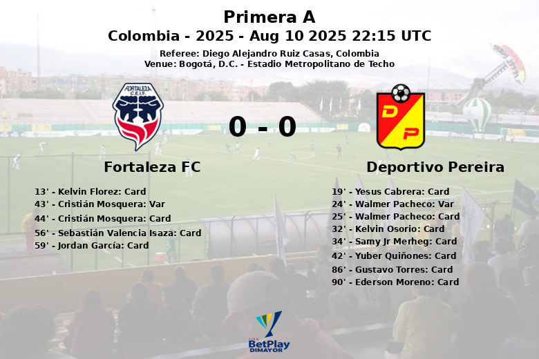 Bogotá, D.C. – En un encuentro disputado en el Estadio Metropolitano de Techo, el Deportivo Pereira impuso su juego con un 59% de posesión frente al 41% de Fortaleza FC, en un partido correspondiente a la fecha 6 del Clausura de la Primera A colombiana. El encuentro, arbitrado por Diego Alejandro Ruiz Casas, se caracterizó por un alto número de amonestaciones.