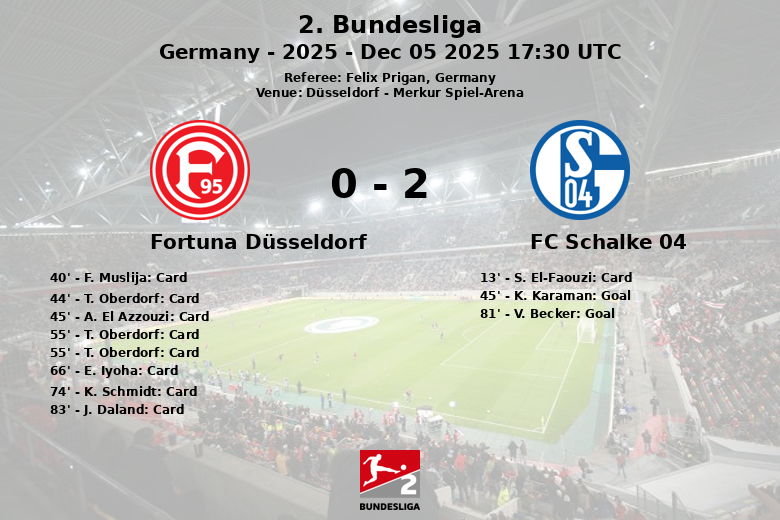 En un partido disputado en el Merkur Spiel-Arena de Düsseldorf, el FC Schalke 04 logró una importante victoria frente al Fortuna Düsseldorf, en un encuentro marcado por la alta tensión y la indisciplina del equipo local. El partido, válido por la jornada 15 de la 2. Bundesliga, terminó con un marcador favorable al Schalke 04.