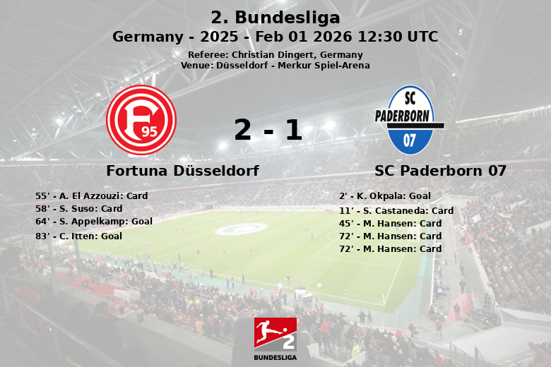 El partido estuvo marcado por la intensidad y las numerosas faltas, reflejado en la gran cantidad de tarjetas mostradas. El Paderborn acumuló tres amarillas (S. Castaneda, M. Hansen -doble-) y una roja para M. Hansen, mientras que el Düsseldorf vio dos amarillas (A. El Azzouzi, S. Suso).
