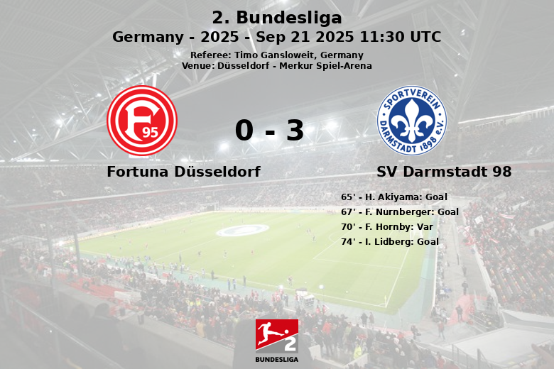 El encuentro se mantuvo igualado hasta que H. Akiyama rompió el empate en el minuto 65, tras una asistencia de I. Lidberg. Poco después, F. Nurnberger amplió la ventaja para el Darmstadt 98 en el minuto 67. Aunque un gol de F. Hornby fue anulado por fuera de juego en el minuto 70 tras revisión del VAR, I. Lidberg se encargó de sellar la victoria para los visitantes en el minuto 74.
