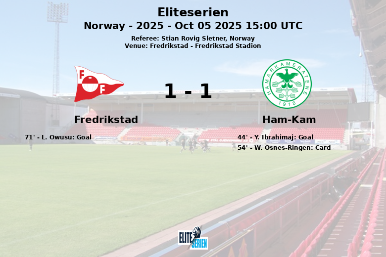 Fredrikstad, 5 de octubre de 2025 – En un partido disputado en el Fredrikstad Stadion, el Fredrikstad y el Ham-Kam empataron tras un encuentro con mucha acción y alternativas. El Ham-Kam se adelantó al filo del descanso con un gol de Y. Ibrahimaj en el minuto 44, tras una asistencia de L. Mares.
