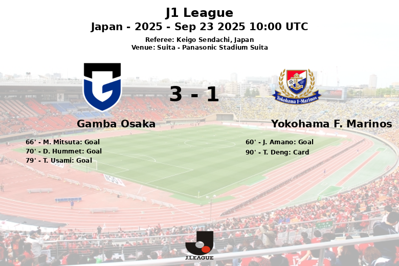 Aunque el Yokohama F. Marinos abrió el marcador al minuto 60 con un gol de J. Amano, el Gamba Osaka reaccionó con contundencia. M. Mitsuta igualó el marcador al minuto 66, asistido por R. Handa, dando inicio a una remontada que se concretaría con los goles de D. Hummet al 70′ (asistencia de Juan Alano) y T. Usami al 79′.