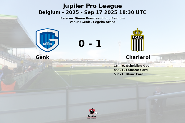 En un partido disputado en la Cegeka Arena, el Charleroi logró una importante victoria como visitante ante el Genk. A pesar de la abrumadora posesión del balón por parte del Genk (68% contra 32%), el Charleroi supo aprovechar sus oportunidades. A los 16 minutos, A. Scheidler abrió el marcador para el Charleroi con un gol tras una asistencia de L. Blum. A pesar de los intentos del Genk por igualar el marcador, el Charleroi se mantuvo sólido en defensa. El Genk dominó en tiros totales (15 contra 9) y tiros a puerta (4 contra 2) pero no logro concretar sus ocaciones. El partido también estuvo marcado por la intensidad en el juego, con un total de 22 faltas y dos tarjetas amarillas mostradas al Charleroi (E. Camara y L. Blum). El Genk no recibió ninguna tarjeta amarilla. El Charleroi se lleva tres valiosos puntos de Genk, sorprendiendo con su efectividad y solidez defensiva.