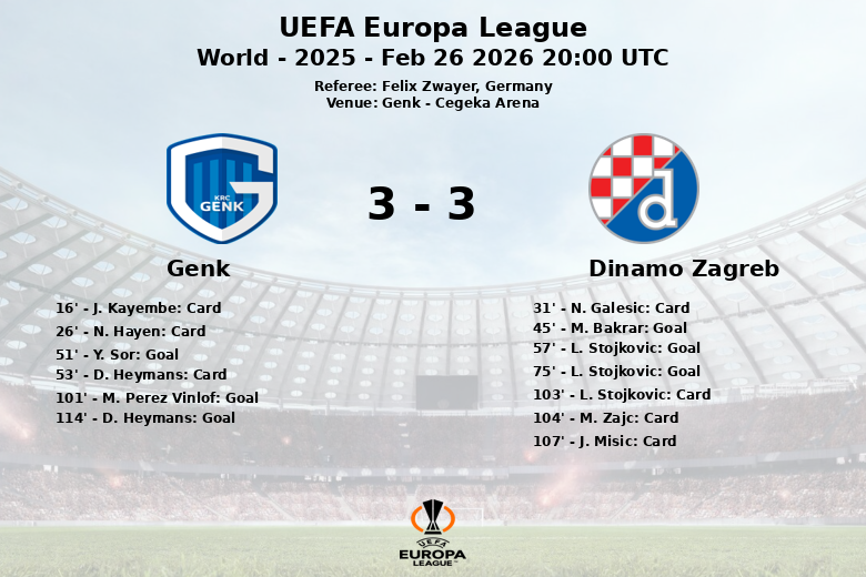 En un partido vibrante y lleno de alternativas, el Genk logró imponerse al Dinamo Zagreb en la prórroga por un marcador de 4 a 3, en un encuentro correspondiente a la UEFA Europa League disputado en el Cegeka Arena. El partido, arbitrado por el alemán Felix Zwayer, estuvo marcado por la intensidad y la lucha constante por el control del juego.