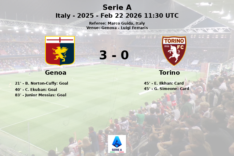 Génova, Italia – En un partido dominado en gran parte por el equipo local, el Genoa venció al Torino en el estadio Luigi Ferraris con una sólida actuación. El Genoa, con un 61% de posesión, controló el ritmo del partido y generó numerosas oportunidades de gol. B. Norton-Cuffy abrió el marcador en el minuto 21, seguido por C. Ekuban en el minuto 40, consolidando la ventaja antes del descanso.