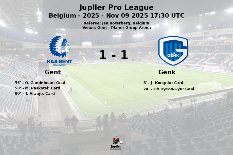 El árbitro Jan Boterberg mostró tres tarjetas amarillas a lo largo del encuentro, una para el Genk (J. Kongolo) y dos para el Gent (M. Paskotsi y T. Araujo). Con este empate, ambos equipos suman un punto valioso en su búsqueda de mejores posiciones en la Jupiler Pro League.