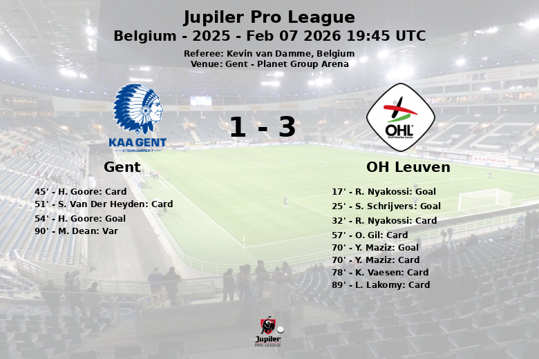 El OH Leuven tomó la delantera temprano con un gol de R. Nyakossi en el minuto 17, asistido por Y. Maziz, mostrando una gran efectividad en ataque. Poco después, S. Schrijvers amplió la ventaja con un penal en el minuto 25. Sin embargo, el Gent no se rindió y H. Goore descontó en el minuto 54, asistido por M. Skoras, reavivando las esperanzas del equipo local.