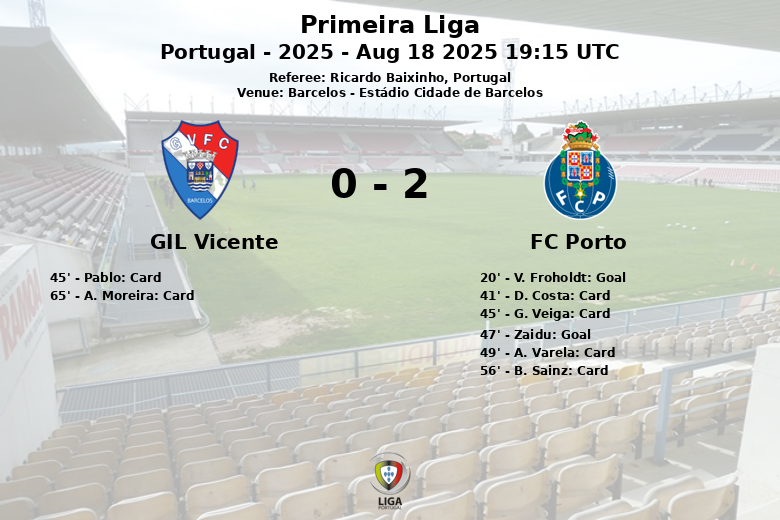 En la segunda mitad, Zaidu amplió la ventaja para el Porto al minuto 47, sin asistencia. A pesar de los esfuerzos del Gil Vicente, con un 41% de posesión y 12 tiros, solo lograron 2 tiros a puerta. El Porto, por su parte, registró 15 tiros, 4 de ellos a puerta. El árbitro Ricardo Baixinho mostró varias tarjetas amarillas adicionales a A. Varela y B. Sainz del Porto, y a A. Moreira del Gil Vicente. El partido finalizó con una clara victoria para el FC Porto, que demostró su calidad en el campo.