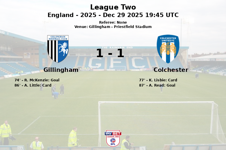 Gillingham, Inglaterra – En un partido disputado en el Priestfield Stadium, Gillingham y Colchester United empataron en un encuentro correspondiente a la jornada 23 de la League Two. El partido, jugado bajo la temporada 2025, vio a ambos equipos luchando arduamente por la victoria.