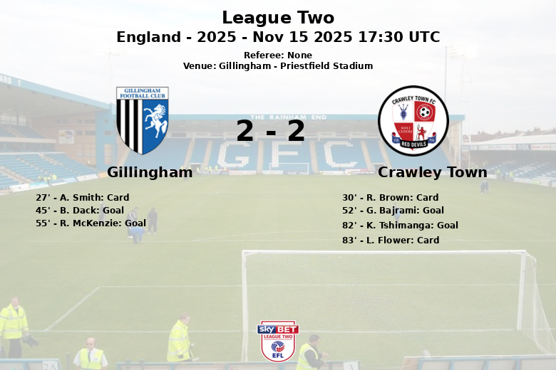 El partido no dio respiro y K. Tshimanga igualó el marcador para Crawley Town al minuto 82, gracias a un pase de J. Flint, sellando el empate final. L. Flower del Crawley Town recibió una tarjeta amarilla al minuto 83. Gillingham realizó 17 tiros, de los cuales 9 fueron a puerta, mientras que Crawley Town intentó 20 disparos con 8 dirigidos al arco. El partido concluyó con 8 corners para Gillingham y 7 para Crawley Town, reflejando la intensidad del encuentro.