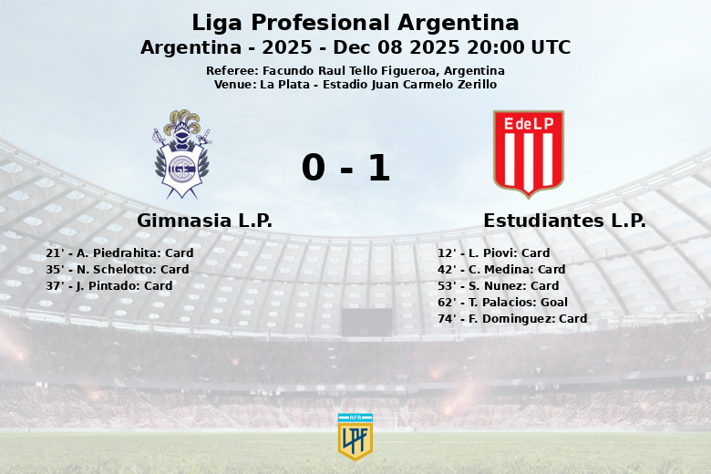 La Plata, Argentina – En un clásico platense cargado de tensión y tarjetas, Estudiantes de La Plata se impuso a Gimnasia y Esgrima La Plata en el Estadio Juan Carmelo Zerillo. El partido, válido por las semifinales de la Liga Profesional Argentina, temporada 2025, se definió por la mínima diferencia gracias a un gol de T. Palacios al minuto 62, con asistencia de E. Cetre.