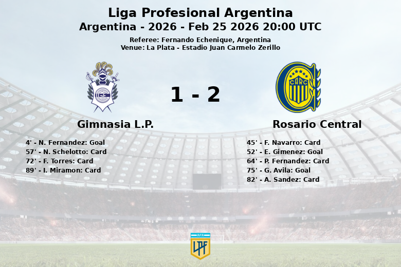 El encuentro se caracterizó por una alta intensidad, reflejada en las numerosas faltas cometidas por ambos equipos (14 por Gimnasia y 19 por Rosario Central) y las seis tarjetas amarillas mostradas por el árbitro Fernando Echenique. Gimnasia, a pesar de tener más tiros al arco (5 contra 2 de Rosario Central), no logró concretar y se quedó con el 45% de la posesión. El partido, disputado en el Estadio Juan Carmelo Zerillo, deja a Rosario Central con una importante victoria en condición de visitante.