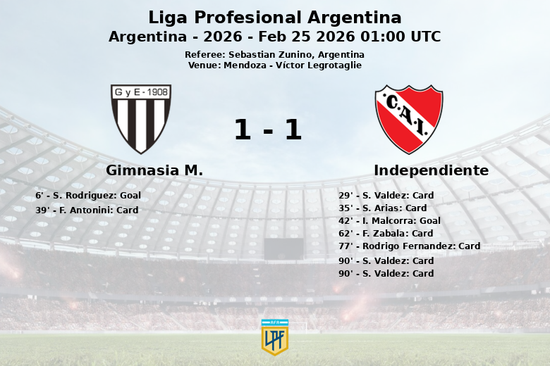 Gimnasia M. se adelantó temprano en el marcador al minuto 6 con un gol de S. Rodriguez, tras una asistencia de F. Antonini. El conjunto local parecía tener el control, aunque Independiente respondía con ataques esporádicos. La primera mitad se caracterizó por la intensidad y la disputa en el mediocampo, reflejada en las tarjetas amarillas mostradas a S. Valdez y S. Arias por Independiente, y a F. Antonini por Gimnasia M.
