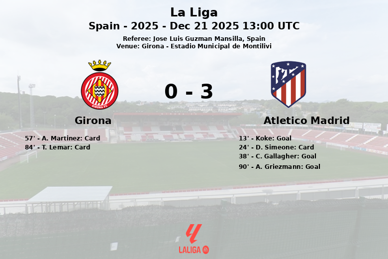 Girona, España – En un encuentro disputado en el Estadio Municipal de Montilivi, el Atlético de Madrid se impuso al Girona con una actuación sólida y efectiva. El partido, correspondiente a la jornada 17 de La Liga, temporada 2025, vio al equipo colchonero llevarse la victoria gracias a una notable demostración de contundencia ofensiva.