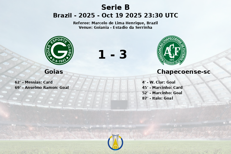 Goiás respondió en el minuto 69 con un gol de Anselmo Ramon, asistido por Brayann, acortando la distancia en el marcador. Sin embargo, Chapecoense selló la victoria en el minuto 87 con un gol de Italo, asistido por Marcinho, dejando el marcador final en 3 a 1.