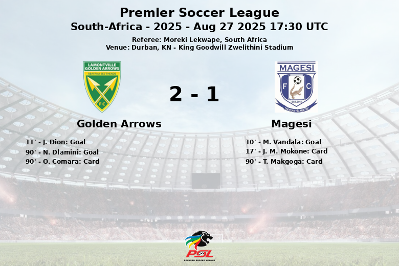 La tensión se mantuvo alta hasta el último minuto, cuando N. Dlamini selló la victoria para Golden Arrows con un gol en el minuto 90, asistido por J. Dion. El árbitro Moreki Lekwape tuvo trabajo extra en los minutos finales, mostrando tarjetas amarillas a O. Comara de Golden Arrows y a T. Makgoga de Magesi. El partido, lleno de emoción y alternativas, confirma la competitividad de la Premier Soccer League.