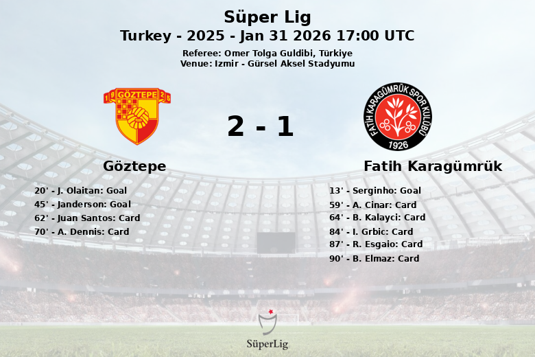El Fatih Karagümrük abrió el marcador en el minuto 13 con un gol de Serginho, asistido por B. Kalayci. Sin embargo, el Göztepe reaccionó rápidamente y J. Olaitan empató el partido en el minuto 20. Antes del descanso, Janderson adelantó al Göztepe en el minuto 45, sellando una primera mitad favorable al equipo local.