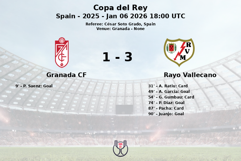 El Granada CF tomó la delantera temprano con un gol de P. Saenz al minuto 9, otorgando a los locales una ventaja inicial. Sin embargo, el Rayo Vallecano respondió en la segunda mitad. A. Garcia igualó el marcador al minuto 49. El Rayo continuó su ofensiva, y P. Diaz puso al Rayo Vallecano al frente con un gol al minuto 74, asistido por A. Garcia.
