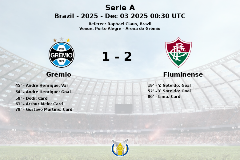 Fluminense abrió el marcador en el minuto 19 gracias a un gol de Y. Soteldo, tras una excelente asistencia de K. Serna. La alegría del Grêmio se vio truncada al final del primer tiempo cuando un gol de Andre Henrique fue anulado por fuera de juego tras la revisión del VAR.