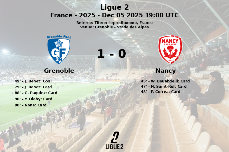 Grenoble, Francia – En un encuentro disputado en el Stade des Alpes, Grenoble logró una victoria ante Nancy en la jornada 16 de la Ligue 2. El partido, marcado por una alta tensión y decisiones arbitrales controvertidas, culminó con un marcador favorable a los locales.
