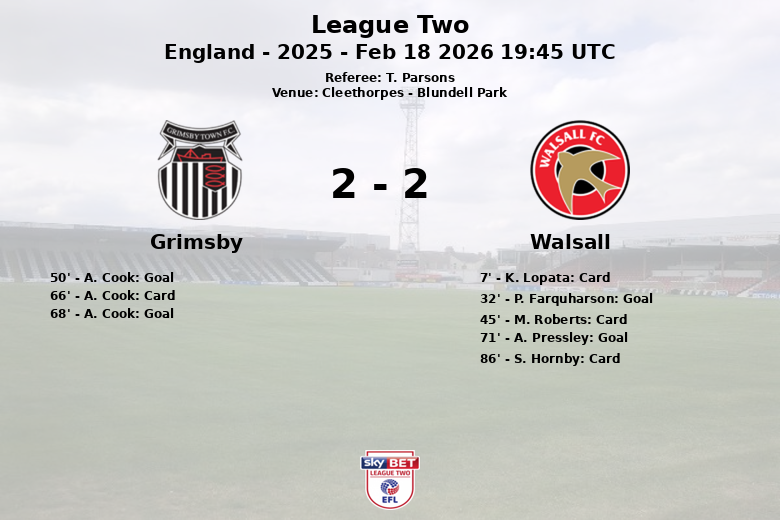 En la segunda mitad, Grimsby aprovechó su superioridad numérica y empató el partido en el minuto 50 con un gol de A. Cook, tras una asistencia de J. Walker. El mismo Cook volvió a aparecer en el minuto 68 para adelantar a los locales, nuevamente con asistencia de Walker. No obstante, Walsall demostró garra y logró el empate en el minuto 71 con un gol de A. Pressley, asistido también por C. Clarke.