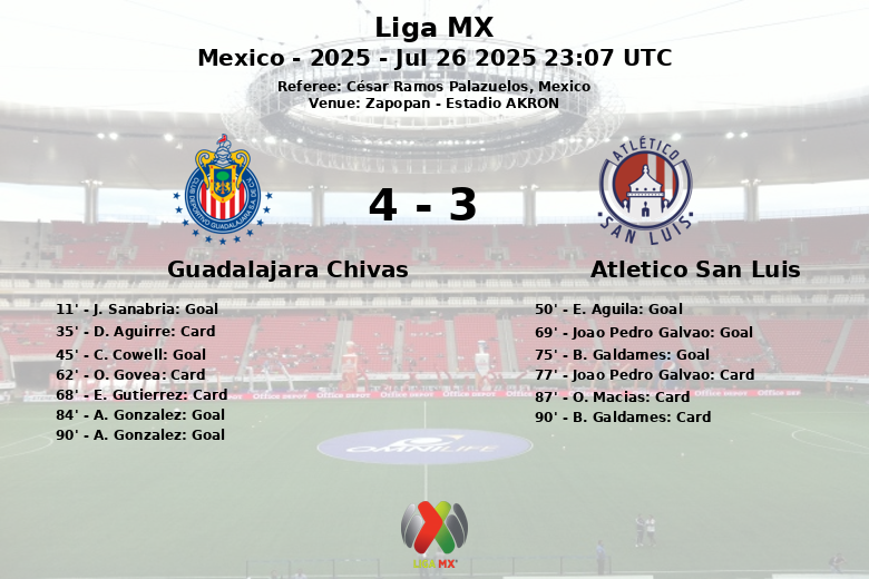 Zapopan, México – En un encuentro electrizante disputado en el Estadio AKRON, Guadalajara Chivas protagonizó una espectacular remontada ante el Atlético San Luis, en partido correspondiente a la jornada 3 del Apertura de la Liga MX. El marcador final reflejó la intensidad del juego con un 4 a 3 favorable al equipo local.
