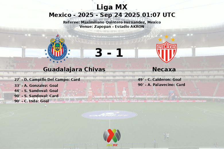 Zapopan, México – En un partido correspondiente a la jornada 10 del Apertura 2025 de la Liga MX, Guadalajara Chivas venció a Necaxa en un duelo emocionante disputado en el Estadio AKRON. El encuentro, arbitrado por Maximiliano Quintero Hernandez, se caracterizó por un ritmo frenético y un alto número de disparos a portería.