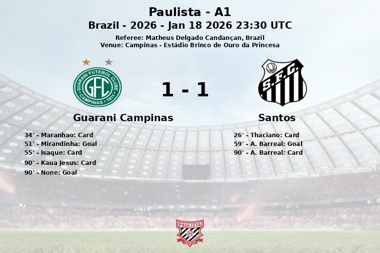Campinas, Brasil – En un partido disputado en el Estádio Brinco de Ouro da Princesa, Guarani y Santos igualaron en un encuentro válido por la tercera ronda de la temporada 2026 del Paulista A1. El partido, arbitrado por Matheus Delgado Candançan, fue intenso y con alternativas para ambos equipos.